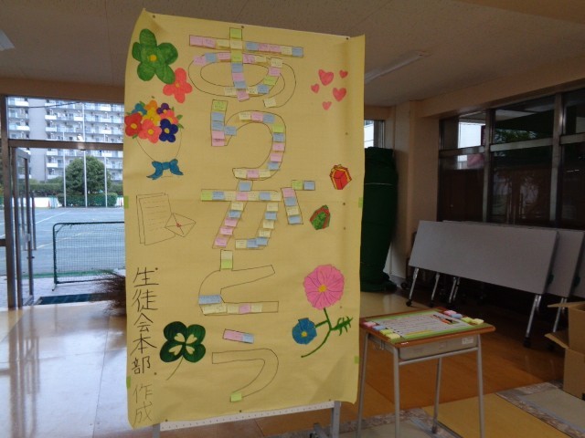 昇降口には「いじめ撲滅週間」の立て看板が設置され、生徒会が準備した「ありがとう」の文字をかたどる掲示も多くの生徒の目を引いています。付箋に書かれた「うれしかったこと」や「感謝の言葉」は朝の間にも増え、掲示板全体が温かい雰囲気に包まれていました。