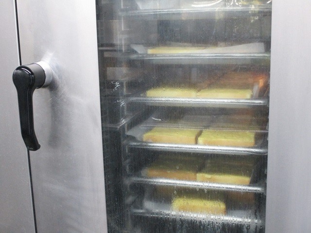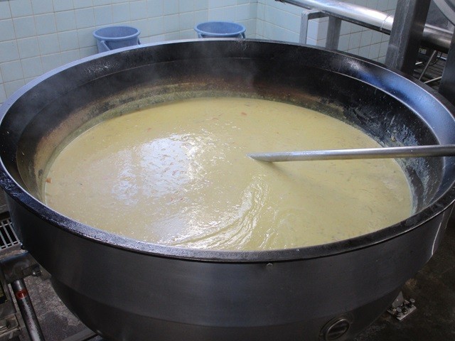 写真は、ビスキュイトーストを焼いている様子、焼き上がったトースト、配缶の様子、そしてクリームスープの調理風景です。