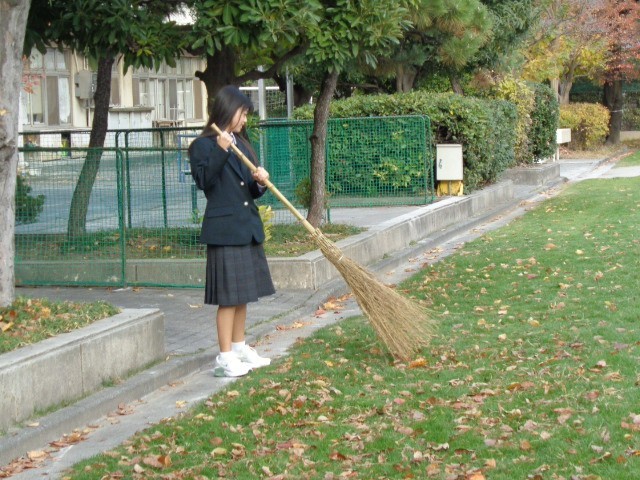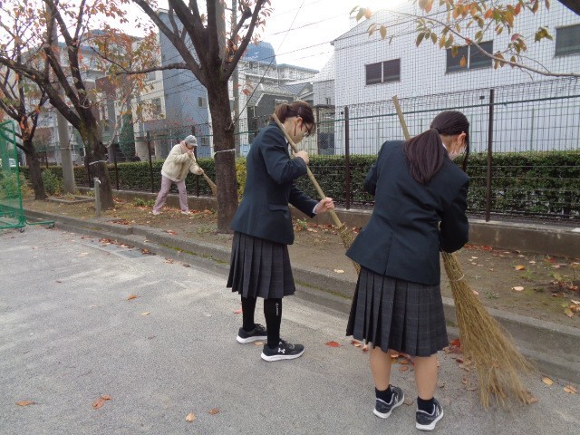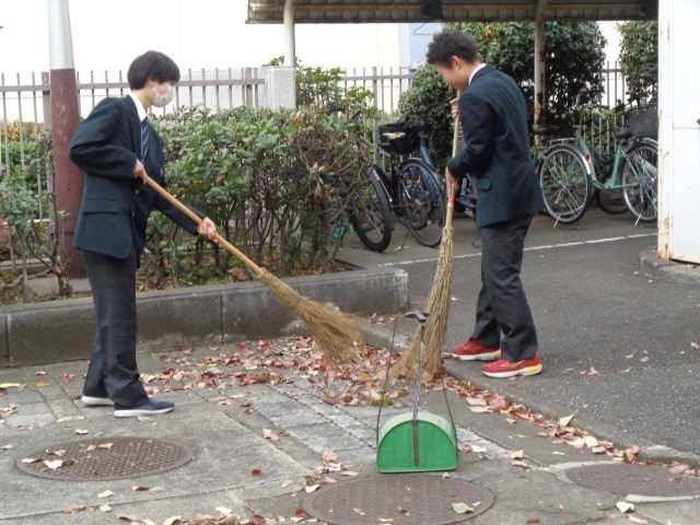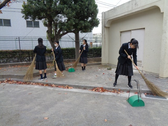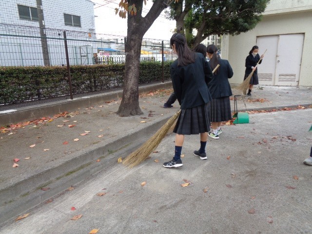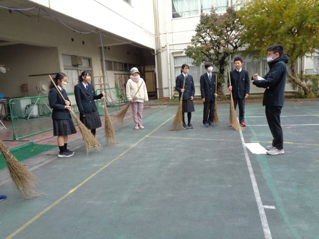 校庭の隅には風に運ばれた落ち葉が折り重なり、集めた袋はすぐにいっぱいになっていきました。校門付近にも落ち葉がたまりやすい場所があり、登校してくる生徒たちを横目に、7年生は黙々と竹ぼうきを動かし続けていました。