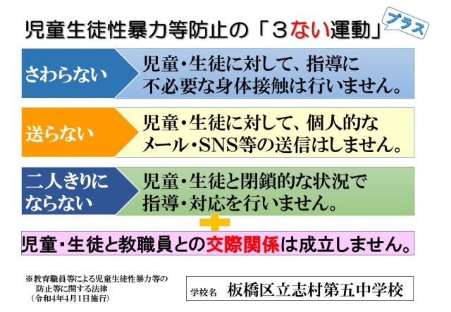 また、人権を大切にするのは生徒のみなさんだけではありません。私たち教職員も同じ気持ちで取り組んでいます。学校では体罰や暴言、性暴力などが起きることがないよう努めています。もし不安に感じることがあれば、信頼できる先生や相談機関に必ず相談してください。