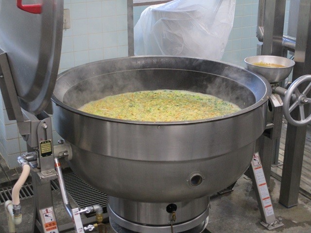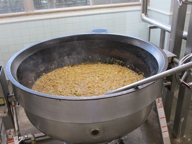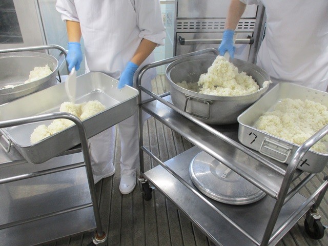 写真は、ご飯の配缶の様子、鶏肉とキャベツのねぎ塩丼の調理風景、むらくも汁の調理風景です。