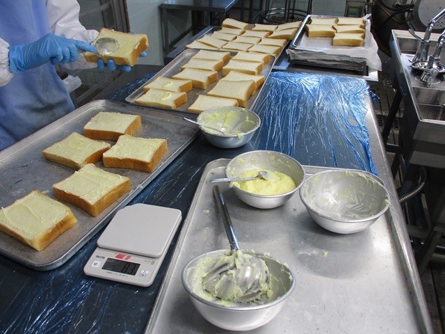 今日の写真は、ミルクトーストを焼いている様子、ミルクトーストの調理風景、そしてチリコンカンを作っている様子です。