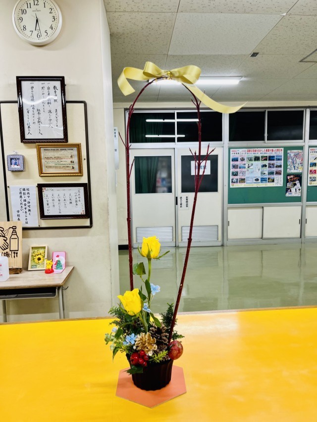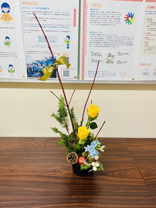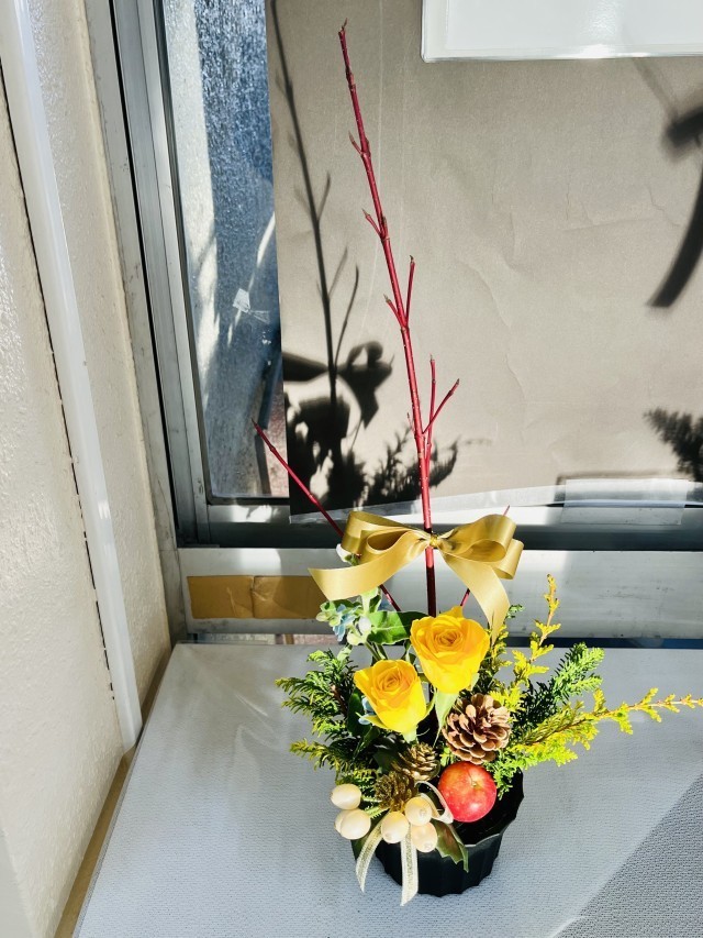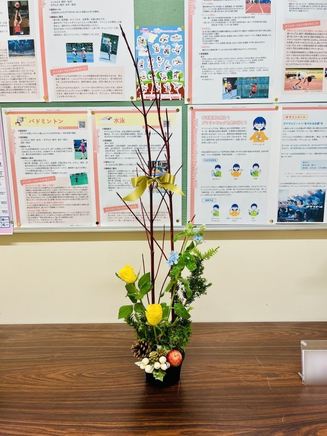 今月の華道展示では、バラを中心に、クジャクヒバ、サンゴミズキ、キュアブルーを用いた作品が展示されています。赤い実のりんごや、まつぼっくり、オーナメント、リボンを組み合わせ、季節感のある構成となっています。