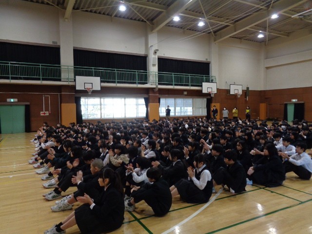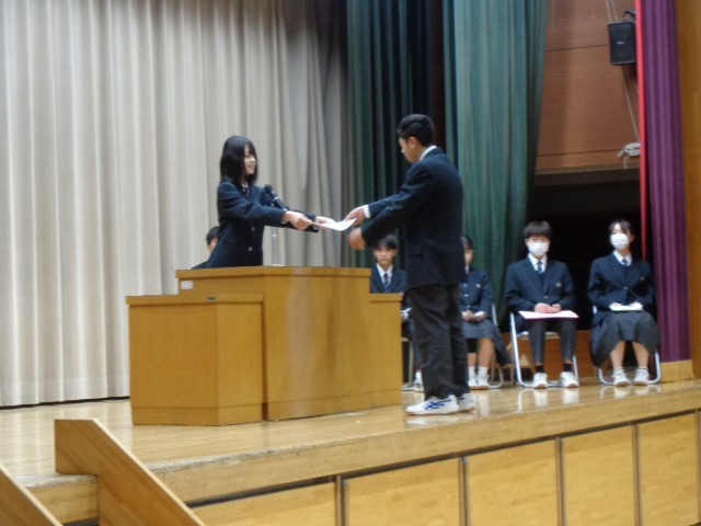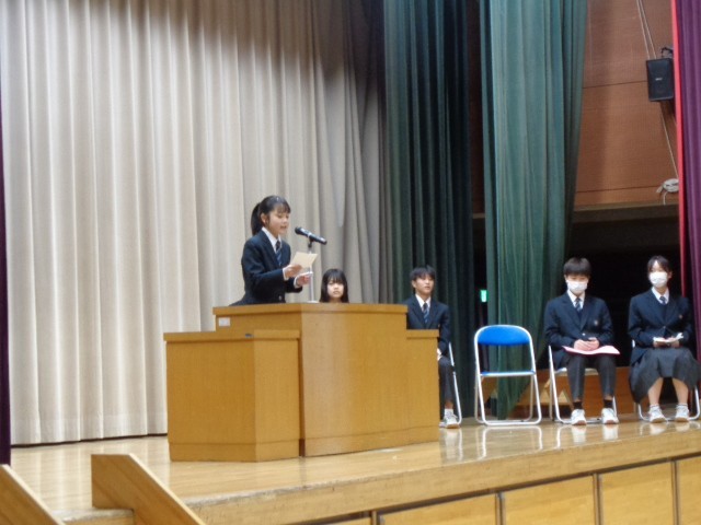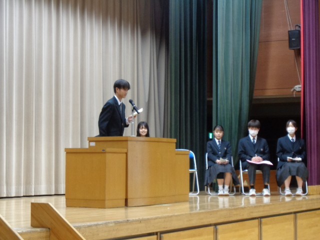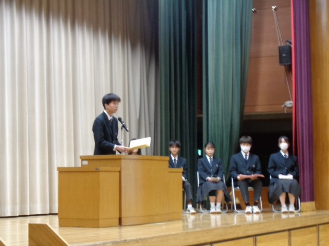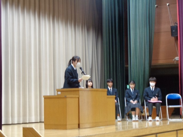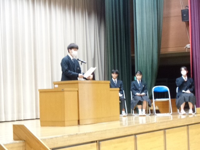 12月の生徒朝礼が行われました。朝礼では、生徒会長をはじめ、各委員会の代表や文化発表実行委員長から、2学期の振り返りや今後の取組についての話がありました。