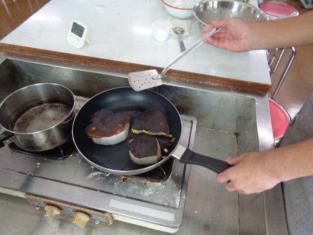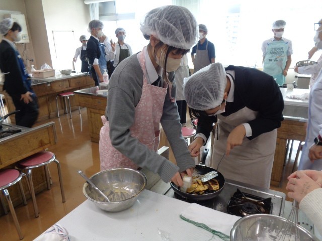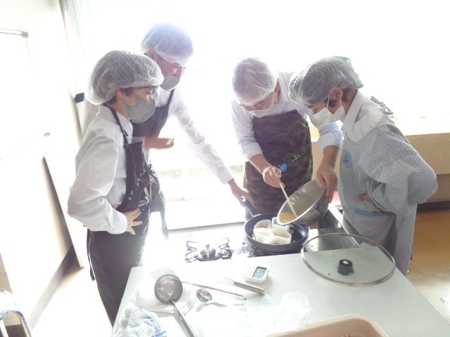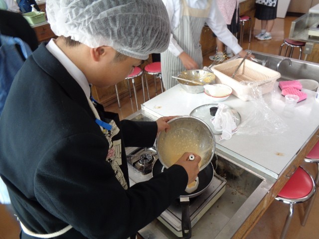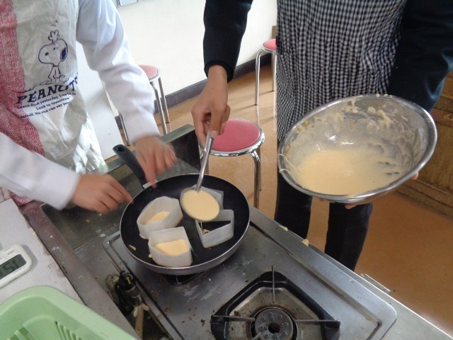 卵白と卵黄を合わせたら、いよいよ加熱調理です。フライパンを一度温めてから冷まし、弱火で生地を焼く工程では、火加減に気を配りながら慎重に作業を進めました。中には、少し火が強くなってしまい、底が焦げてしまって大騒ぎになる班もありました。