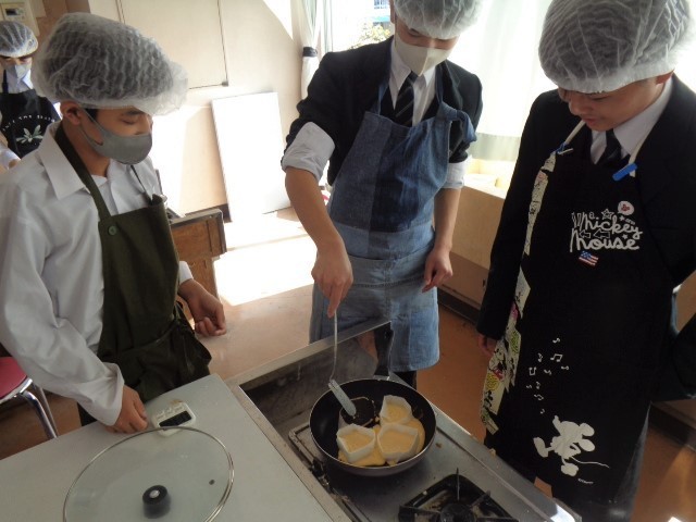 8年生は家庭科の調理実習で、ホットケーキづくりに取り組みました。はじめに卵を卵黄と卵白に分け、卵黄に牛乳とホットケーキミックスを加えて丁寧に混ぜました。卵白は泡だて器を使って、班で交代しながら泡立てていきます。
