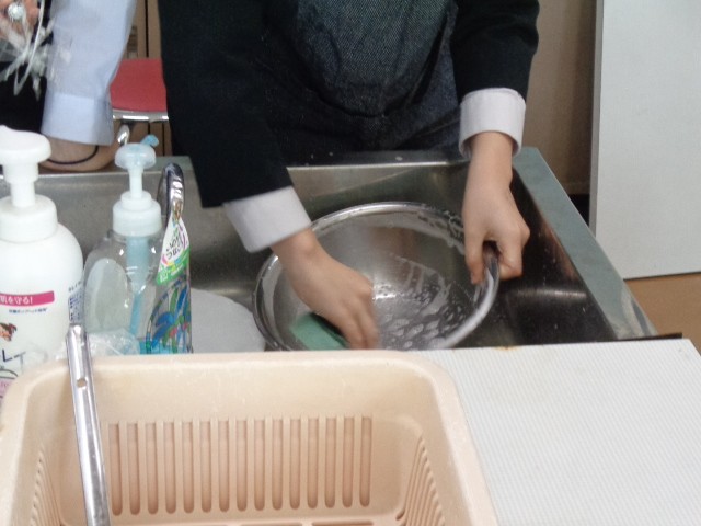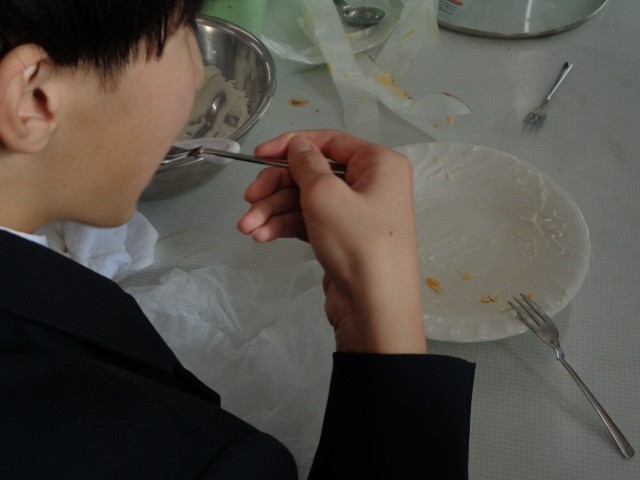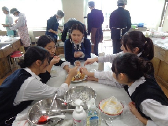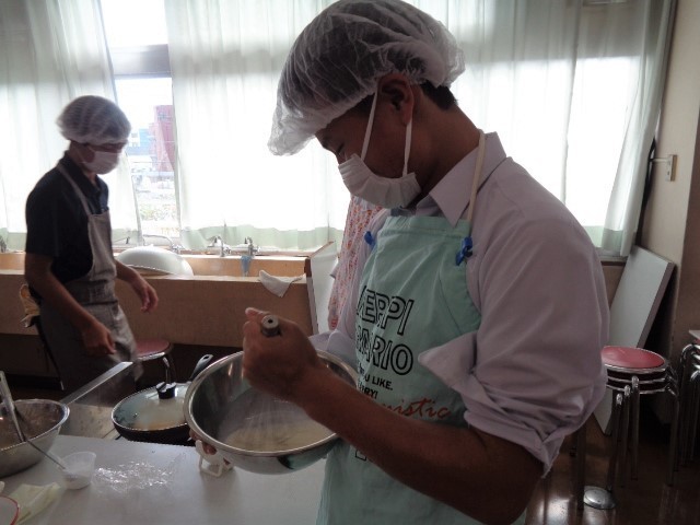 焼いている間には、生クリームの泡立ても行いました。こちらも思った以上に力が必要で、なかなか固まらず時間がかかった班もありましたが、声を掛け合いながら最後まで頑張る姿が見られました。