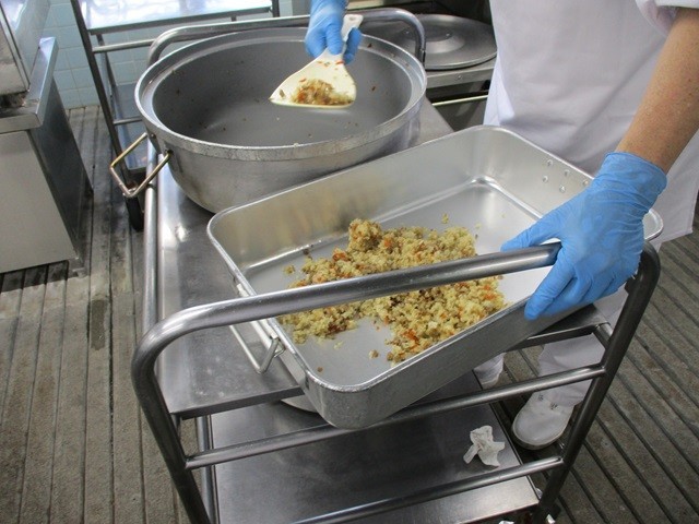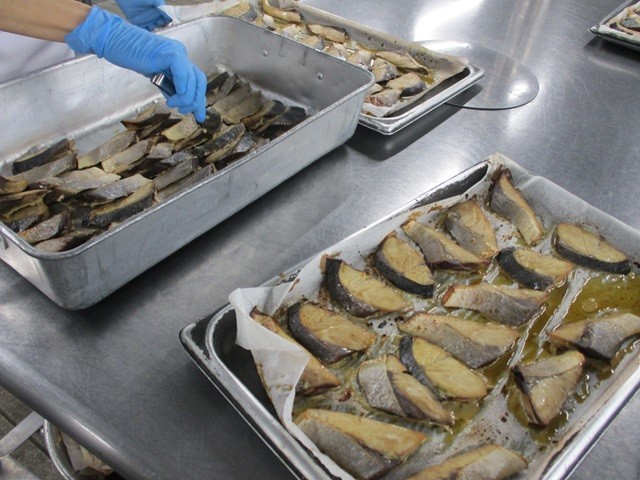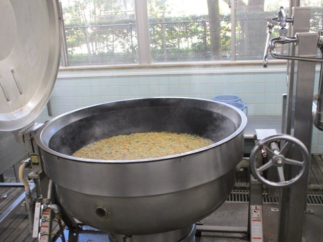 写真は、ご飯の配缶の様子、ぶりの照り焼きの配缶の様子、かきたま汁の調理風景です。