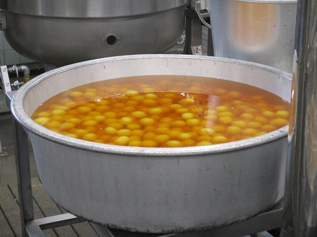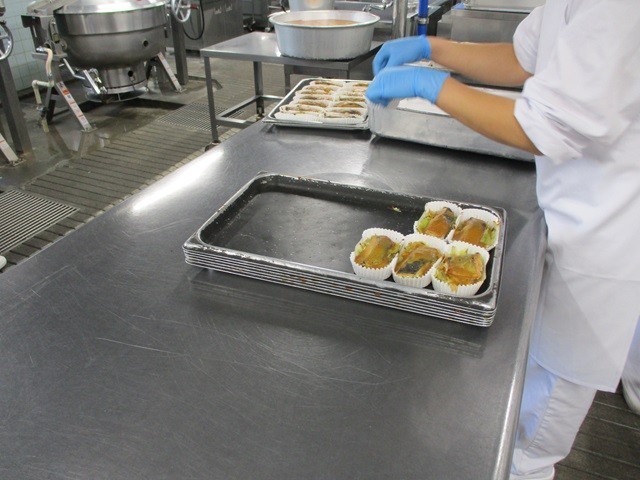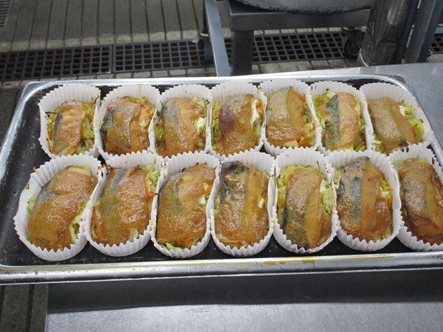 写真は、焼きあがった秋鮭のちゃんちゃん焼き、秋鮭のちゃんちゃん焼きの配缶の様子、いも団子汁のいも団子です。