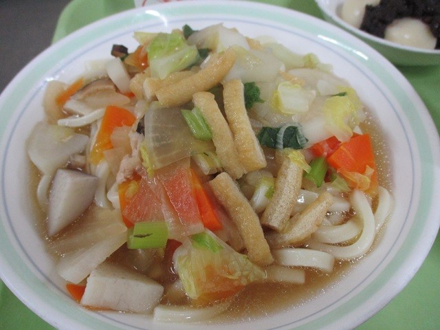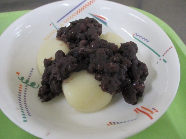 給食室手作りのぜんざいは、小豆の風味がしっかり感じられるやさしい甘さで、もちもちの白玉団子が入っていました。