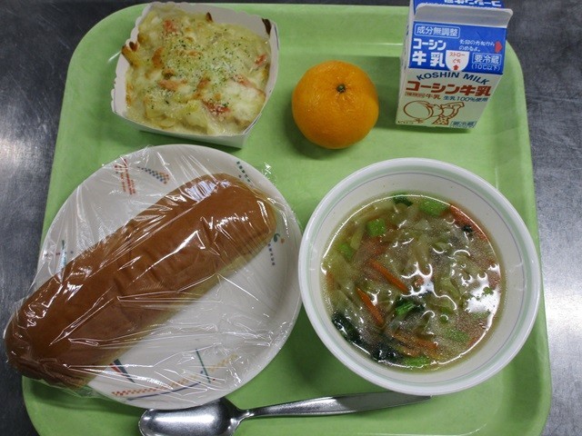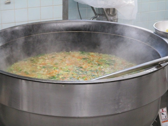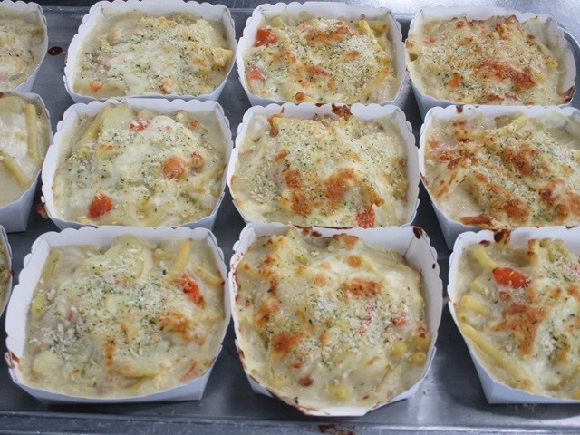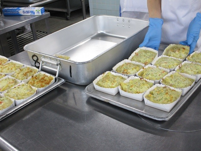 写真は、焼きあがったグラタン、グラタンの配缶の様子、野菜スープの調理風景です。