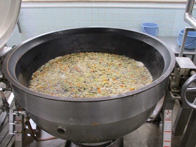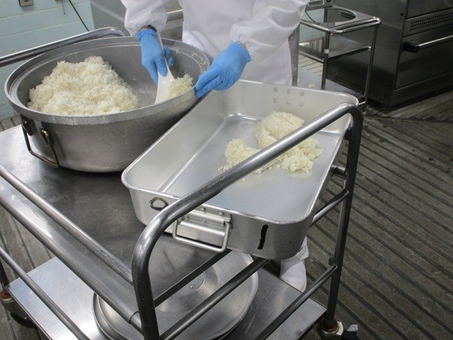 写真は、ご飯の配缶の様子、もずく汁の調理風景です。