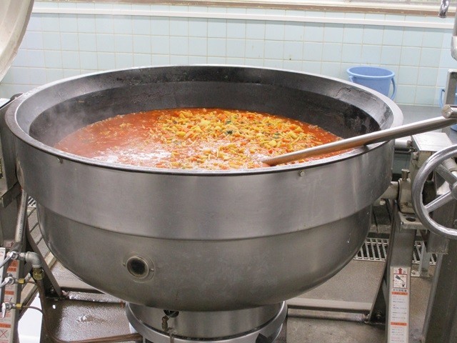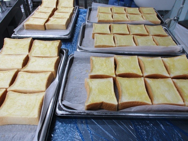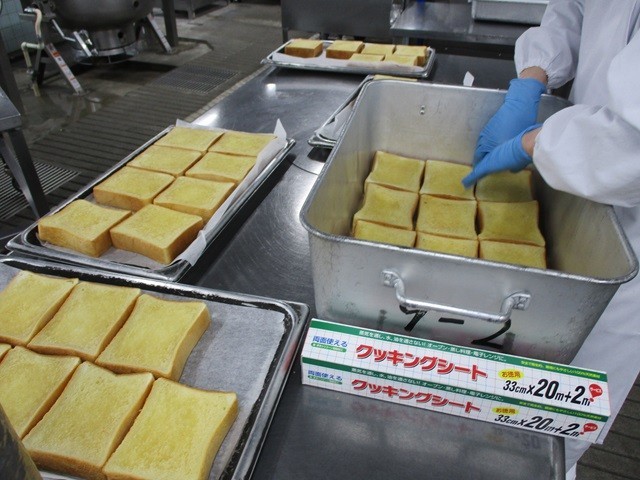 写真は、ハニートーストを焼く前のパンの様子と配缶の様子、マカロニのトマト煮の調理風景です。