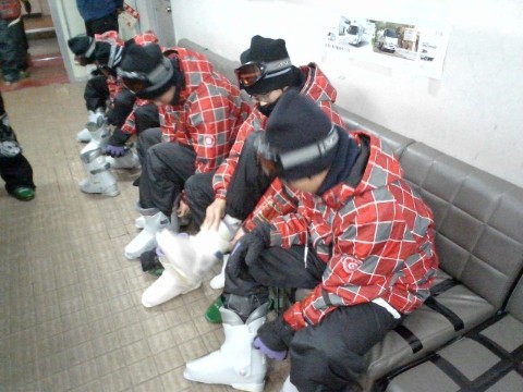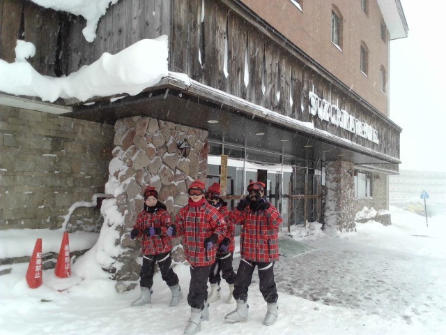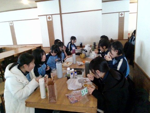信州中野インターチェンジで高速道路を降り、真っ白な雪道を進みます。途中、道の駅でタイヤチェーンを装着し、宿泊先である硯川ホテルへと向かいました。昼食は自宅から持参したお弁当をいただき、予定より少し遅れて、いよいよスキー実習がスタートしました。