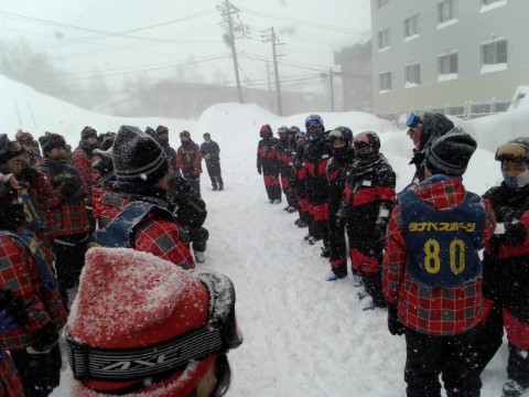 雪が舞う中、実行委員の進行で開講式を行い、2泊3日のスキー教室が始まりました。