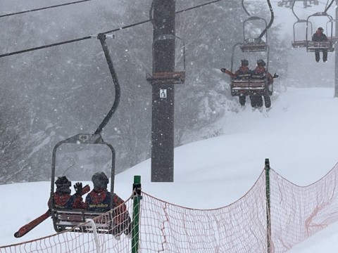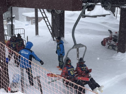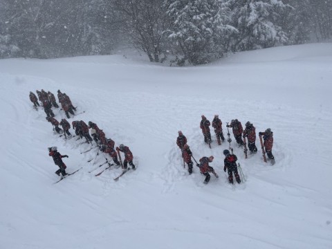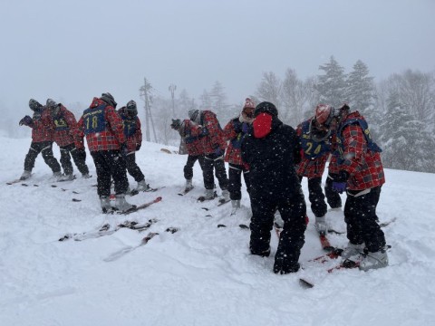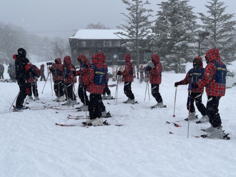 インストラクターの皆さんにあいさつをして、いよいよスキー実習がスタートしました。横手山ゲレンデは、初心者向けのスロープがリフトを降りた先にあるため、初心者の生徒たちもスキー板を担いでリフトに乗り込みました。長いリフトに揺られながら、自然の厳しさを肌で感じる時間となりました。開始がやや遅れ講習時間は短くなりましたが、結果的には無理のない実習となったようです。
