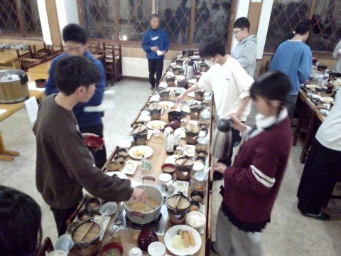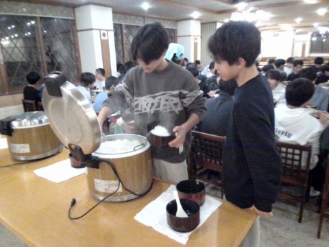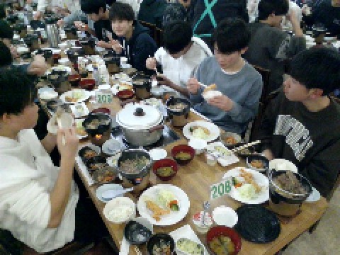 2日目の夕食は、すき鍋を中心に、海老フライ、豚バラと大根の煮物、春雨サラダ、ほうれん草のグラタン、みそ汁、きんぴられんこんの小鉢、デザートにはりんごゼリーと、盛りだくさんの献立でした。食事係のあいさつでは、給食時間でおなじみの「ダジャレ」コーナーを即興で披露し、「りんごを食べたら頭が五厘になっちゃった」と会場を和ませてくれました。また、昨年も見られた恒例(?)の、りんごゼリーをめぐって男子がじゃんけんをする場面が今年も見られ、楽しいひとときとなりました。