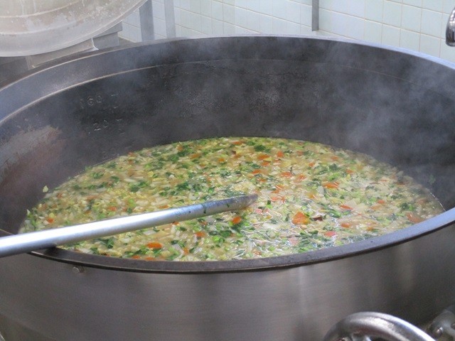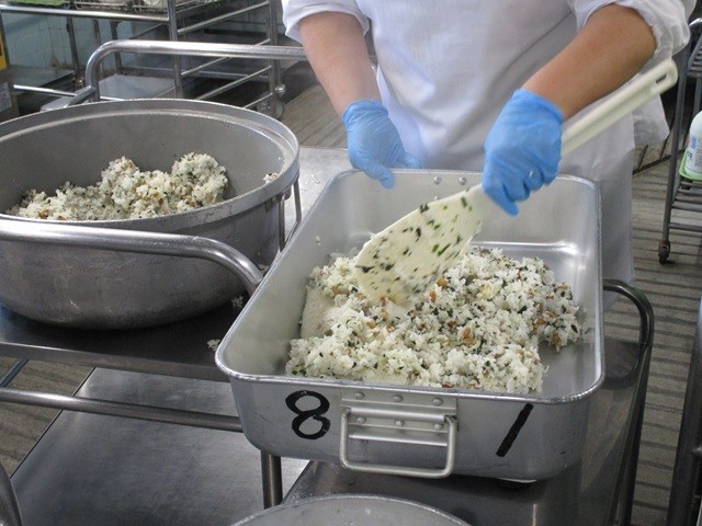 写真は、ご飯の配缶の様子、ハンバーグを焼いている様子、焼きあがったハンバーグ、さつま汁の調理風景です。