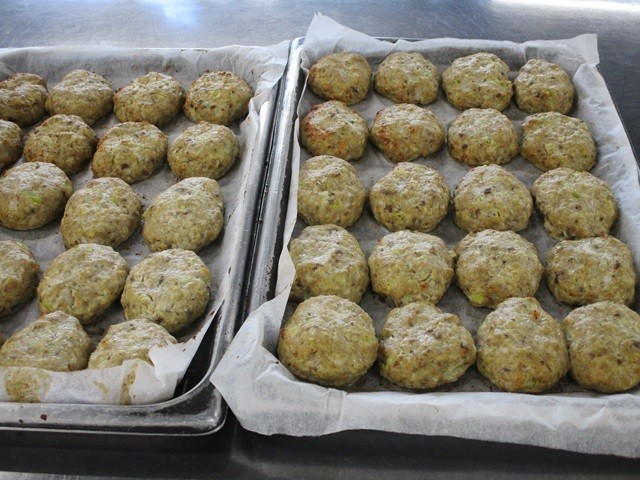 いわしのすり身と鶏ひき肉を合わせたハンバーグ。生姜とみその風味が効いており、ごまのコクも加わって、魚が苦手な人でも食べやすい味わいでした。
