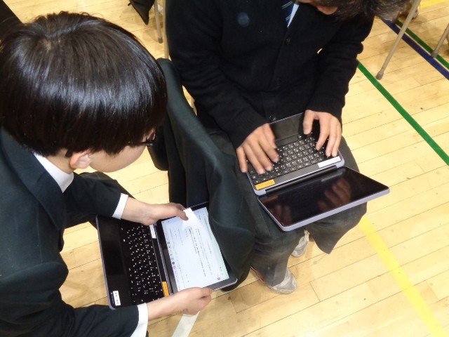 すでに実際に使用できる環境にあることから、指示されたプロンプトを入力してみたり、ペアで生成された回答を比べ合ったりする活動を行いました。「『走れメロス』の感想文を400字で書いて!」というプロンプトの課題点について話し合ったり、苦手な教科について学年末考査の対策を尋ねたりするなど、生成AIの具体的な活用場面を体感する時間となりました。