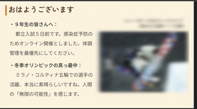 本日の全校朝礼は、9年生が都立高校入試を5日後に控えていることから、感染症予防のためオンラインで実施しました。