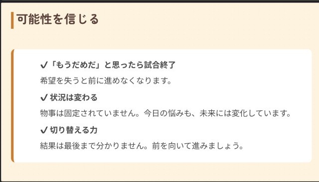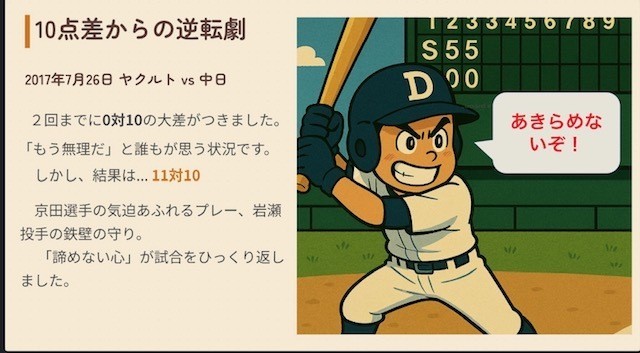 講話では、進路や友人関係、勉強など、誰もが悩みを抱えることがあるが、「もうだめだ」と決めつけず、考え方や状況は時間とともに変わっていくことを大切にしてほしいと伝えました。また、人生を野球の試合に例え、中学生はまだ序盤にいる段階であり、途中の状況だけで可能性を決めることはできないという話をしました。2017年のプロ野球の試合で、10点差を逆転した実例を挙げ、最後まで結果は分からないこと、夢をもち自分の可能性を信じて努力し続けることの大切さについて話しました。