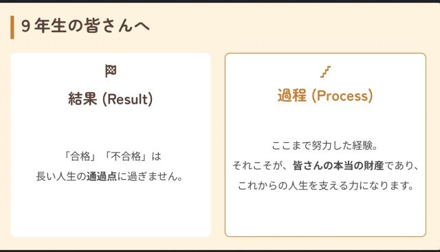 さらに、9年生に向けては、入試の結果だけでなく、そこまで努力してきた過程が必ず自分の力になること、校長自身の受験経験も交えながら、努力を続けることが将来につながるという話をしました。