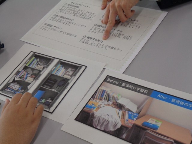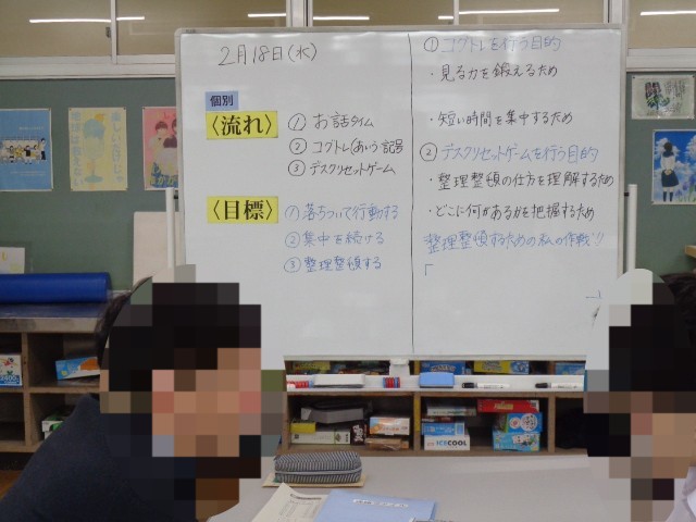 本日のSTEP UP教室では、身の回りの環境を整える力を育てることをねらいとして、「デスク・リセット・ゲーム」に取り組みました。はじめに、整理整頓のポイントについて考え、物を「種類(色・形・用途・重要度)」ごとに分類することや、自分に合った作戦を立てることの大切さを確認しました。