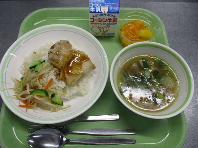パインや黄桃、みかんが入ったフルーツポンチ。食後に甘いデザートを楽しめました。