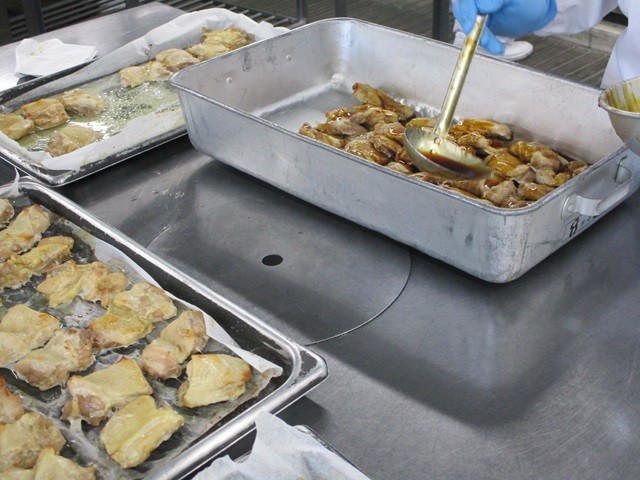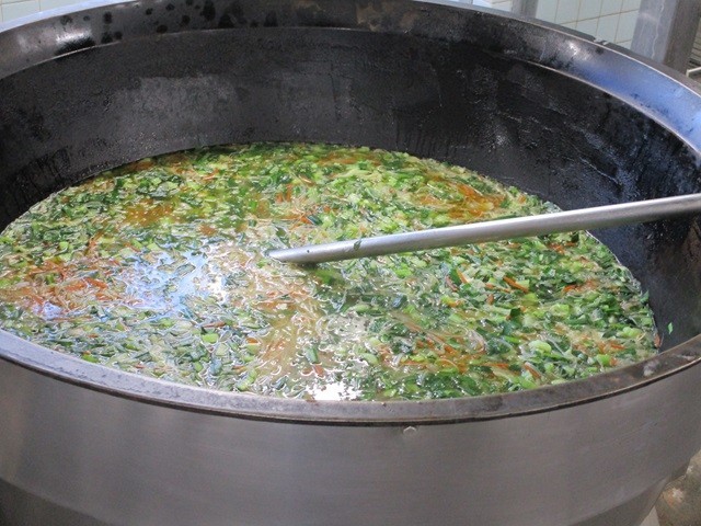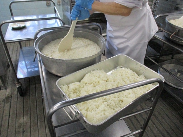 写真は、ライスの配缶の様子、チキンの配缶の様子、ビーフンスープの調理風景です。