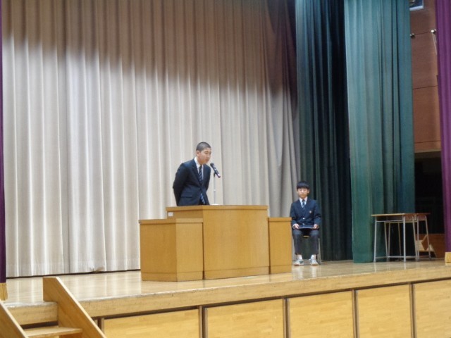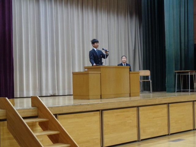 朝礼では、8年生の学級委員長・放送委員長からの話と、生徒会本部役員による寸劇が行われました。