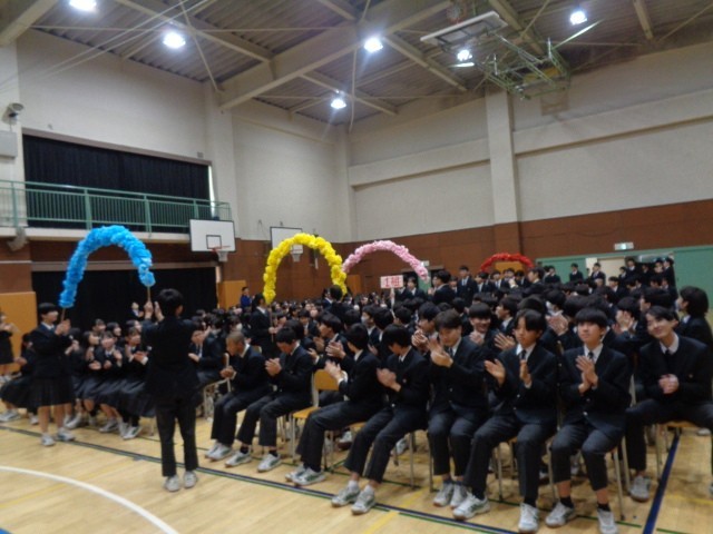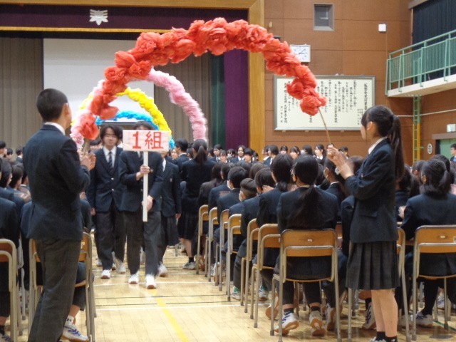 会は、生徒会役員と学級委員がフラワーアーチをつくり、温かな拍手の中で9年生を迎えて始まりました。