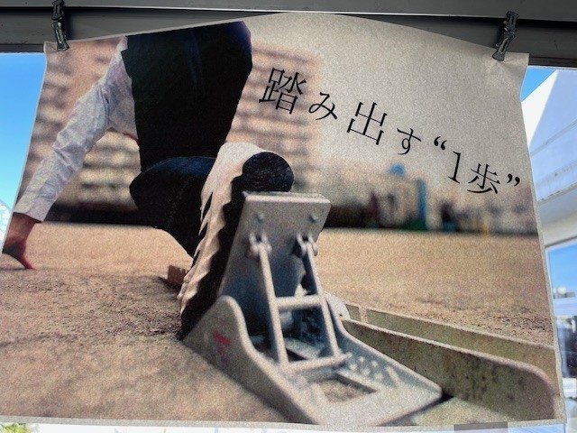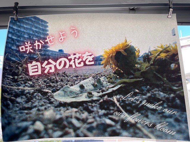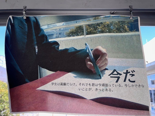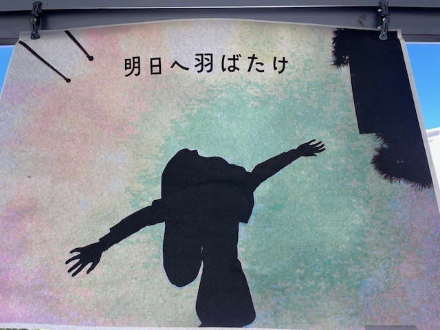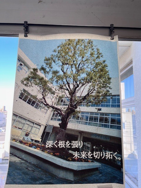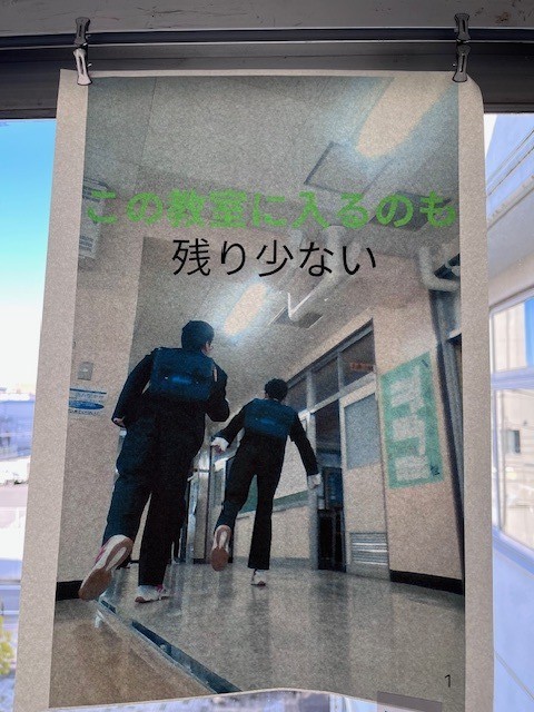 この廊下は、美術の授業に向かう際に通るだけのため、普段はあまり目にする機会がないかもしれません。しかし、校門から校舎を見上げると、「何か掲示されているな」と気付かれた方もいらっしゃるのではないでしょうか。