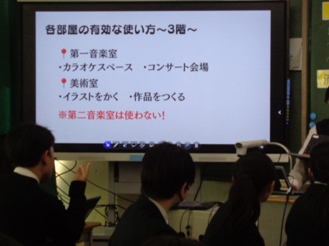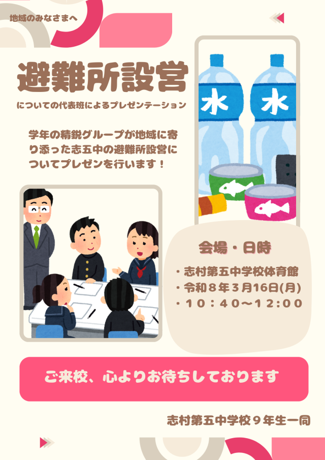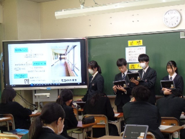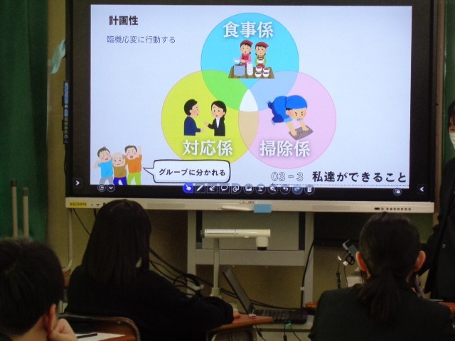 今回の発表では、「よりよい避難所運営」をテーマに、それぞれの班が考えた企画を発表しました。聞き手に分かりやすい表現を工夫し、伝わりやすい声の大きさで発表することを目標に取り組みました。