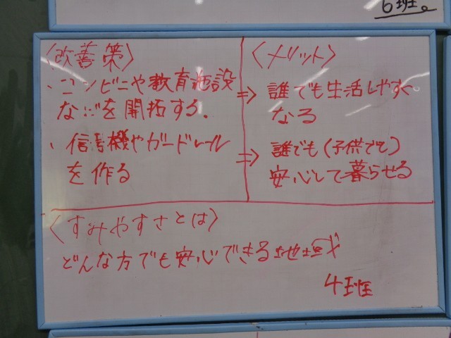 各班では、地域をよりよくするための改善策とそのメリットについて考えました。例えば、「子ども110番の家を増やす」「信号機やガードレールを整備する」「道路を広くする」「細い路地まで明るくする」といった安全面の充実や、「公園や緑を増やす」「飲食店や店舗を充実させる」など、生活環境や利便性の向上に関する意見が多く挙げられました。また、段差をなくした歩道整備など、誰もが安心して移動できる工夫についても考えが深められていました。