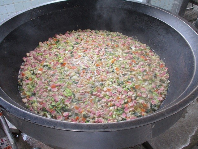 写真は、赤飯の配缶の様子、焼き立ての鶏肉の照り焼き、鶏肉の照り焼きの配缶の様子、すまし汁の調理風景です。