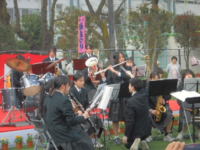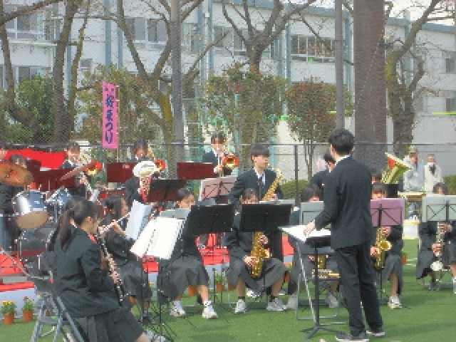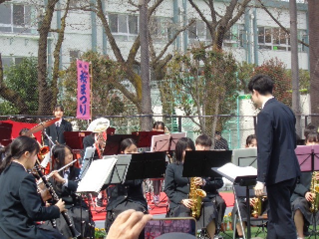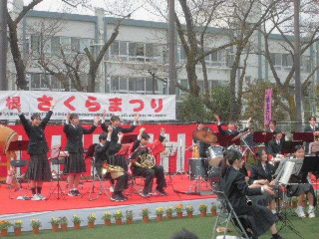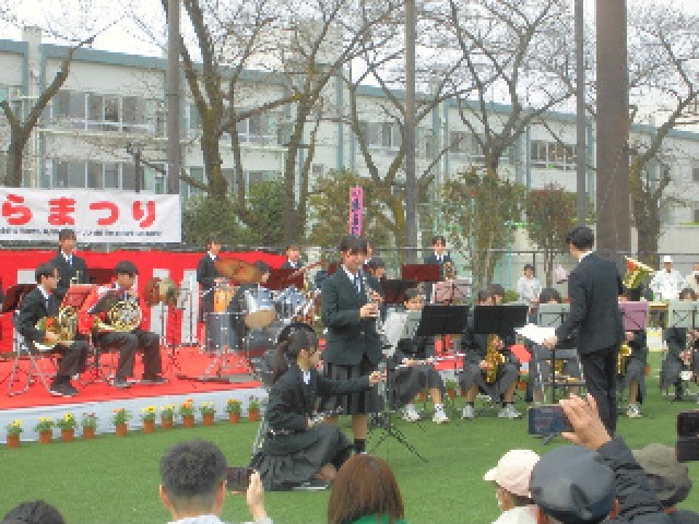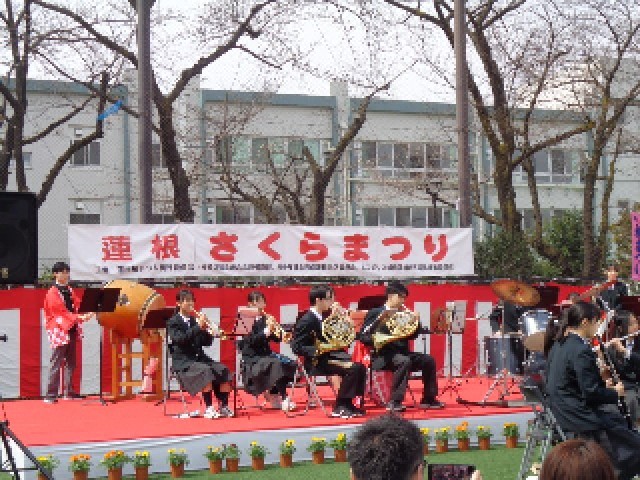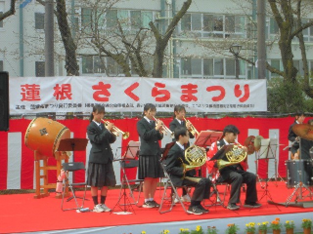 3月22日(日)、地域の「第46回蓮根桜まつり」が開催されました。今年度は本校吹奏楽部にも出演のお声がけをいただき、蓮根花舞台(舞台演芸)の昼休憩の時間に、約30分間の演奏を披露しました。