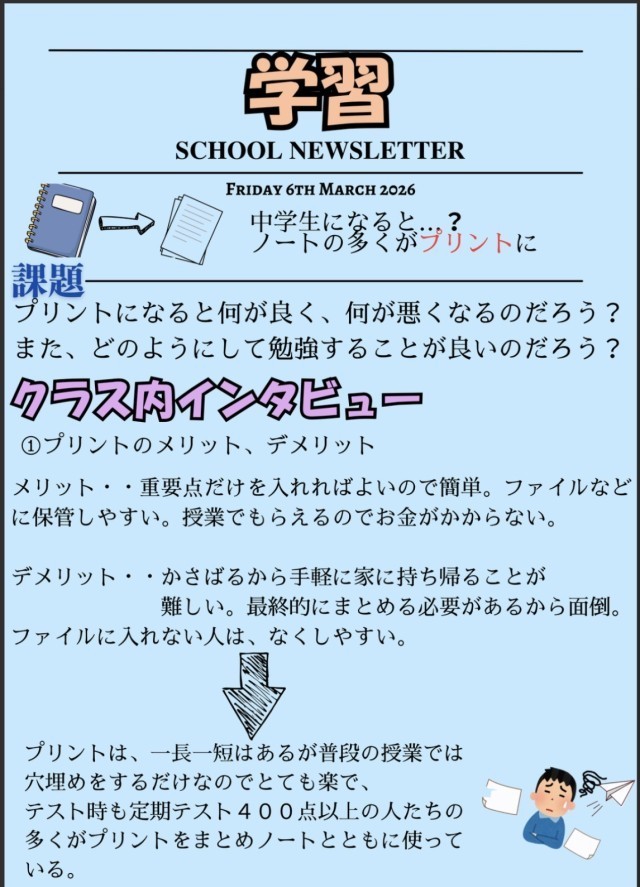 4月1日になりました。新年度のスタートです。今日から3回にわたり、旧8年生から新入生へ向けた「学習やテスト勉強についての学校紹介」をお届けします。