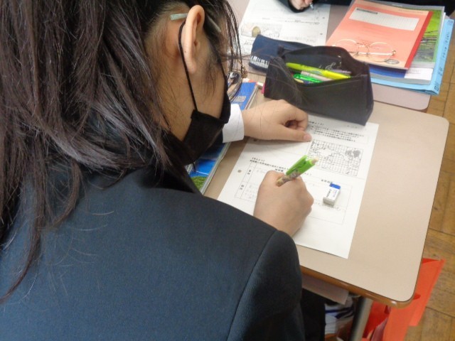最近では、真っ白なノートに黒板の文字を書き写すだけの授業はあまり見られません。配付されるプリントには学習内容がコンパクトにまとめられており、生徒自身がキーワードなどを書き込めるように空欄が設けられています。大切なポイントが分かりやすく、学習を整理しながら取り組める工夫がされています。