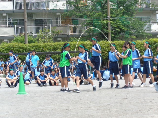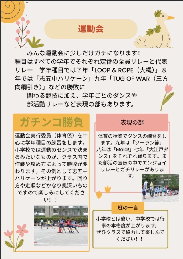 新入生の皆さんへ「運動会」 公開日 2026/04/06 更新日 2026/04/03 できごと 4月6日(月曜日)の学校紹介は、行事ランキングで第1位となっている「運動会」を取り上げています。 7年生の団体競技では、大縄と大江戸ダンスが定番となっています。今年度は5クラスの生徒が入学する予定で、これまで以上にクラス対抗の順位争いが盛り上がることでしょう。今年の運動会は、5月30日(土曜日)です! (写真は、昨年度の運動会当日の様子です。) +5 新入生