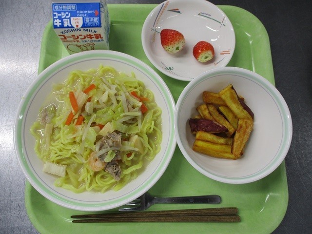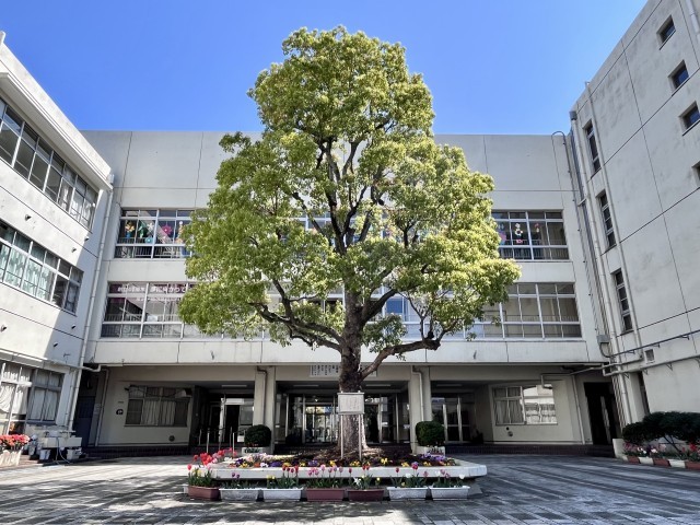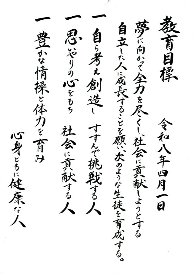 (写真は、2枚目が卒業生が書いた新しい教育目標の書、3~5枚目が給食例、6~7枚目は昨年度の入学式の様子、8枚目は4月3日の校門内の校樹「くすのき」です。)
