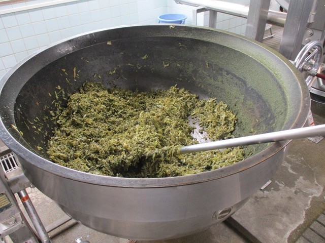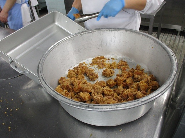 写真は、から揚げの配缶の様子、赤飯の配缶の様子、キャベツのおひたし炒めの調理風景です。