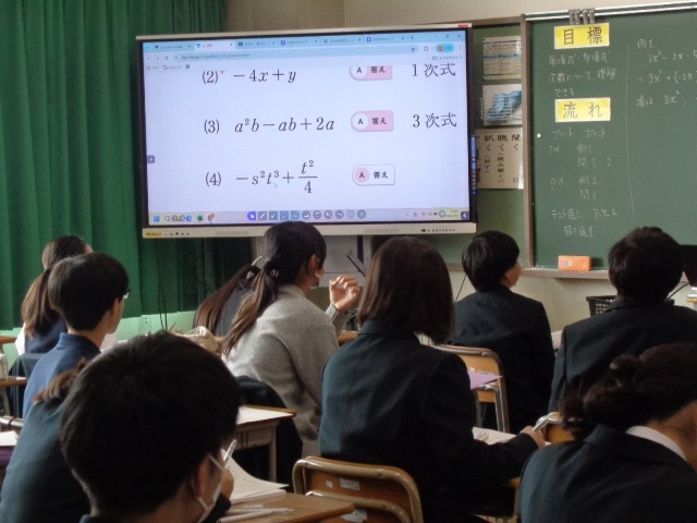 数学では、前時に実施した単元テストの返却があり、「式の計算」における単項式・多項式や次数の意味を理解し、計算力を高めることを目標に学習しました。
