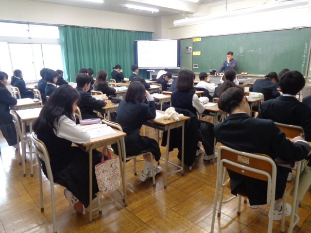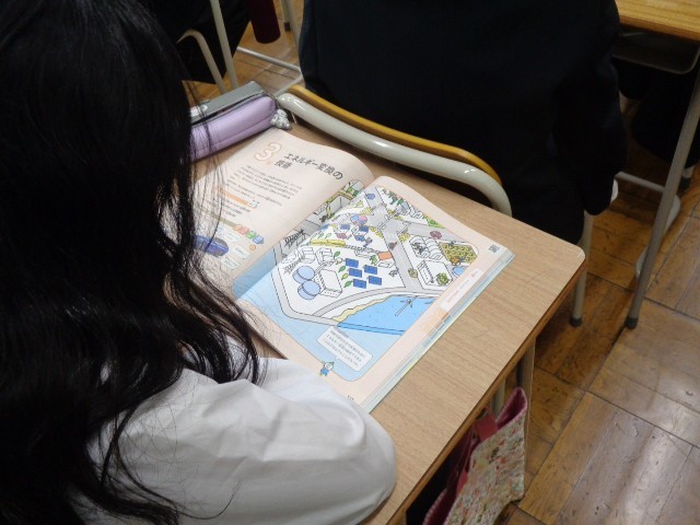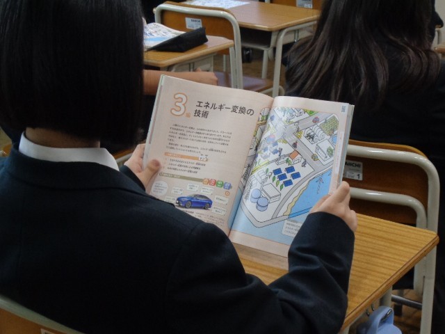 7年生では、木工実習やeラーニング、情報の技術について学習していきます。この日は、エネルギー変換の技術に関する内容にも触れ、発電所はどのような場所にあるのかといった問いに対して、生徒から活発な発言が見られました。
