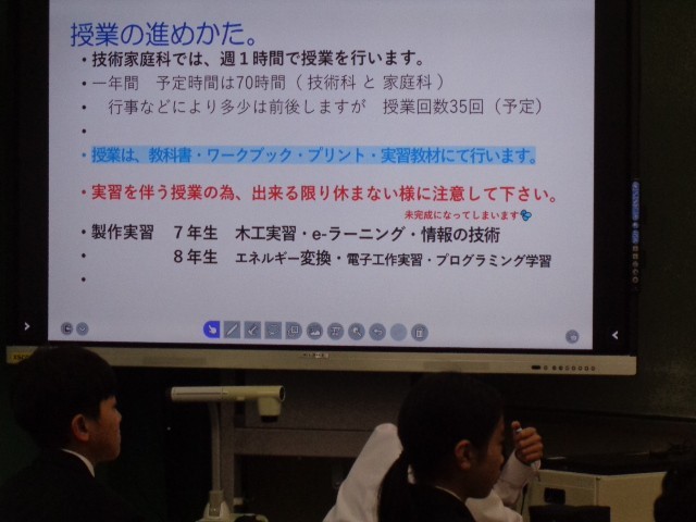中学校で初めて学ぶ「技術・家庭(技術分野)」の授業が始まり、授業の進め方についてオリエンテーションを行いました。実習を伴う教科であるため、欠席すると作業時間が不足し、作品が未完成となる可能性があることから、できるだけ欠席しないことの大切さについて確認しました。