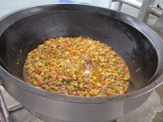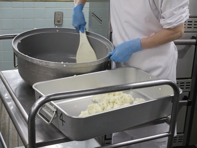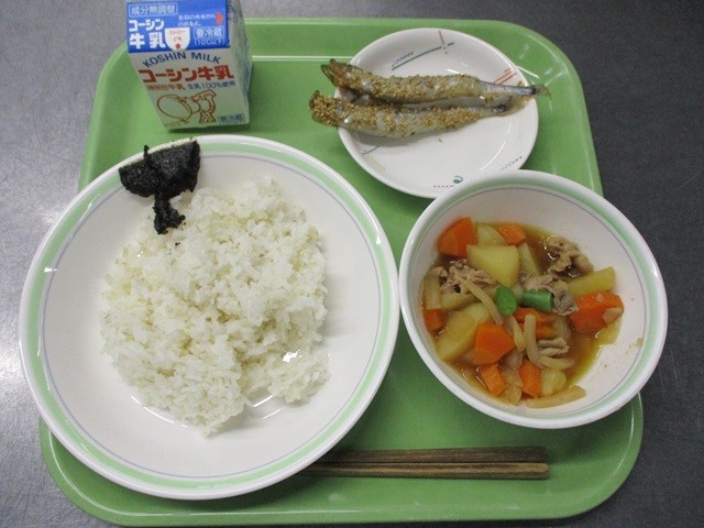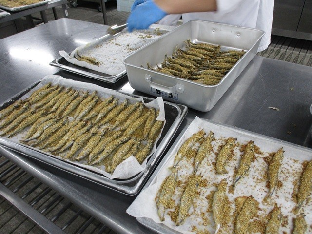 写真は、ご飯の配缶の様子、焼き立てのししゃものごま焼き、ししゃものごま焼きの配缶の様子、肉じゃがの調理風景です。