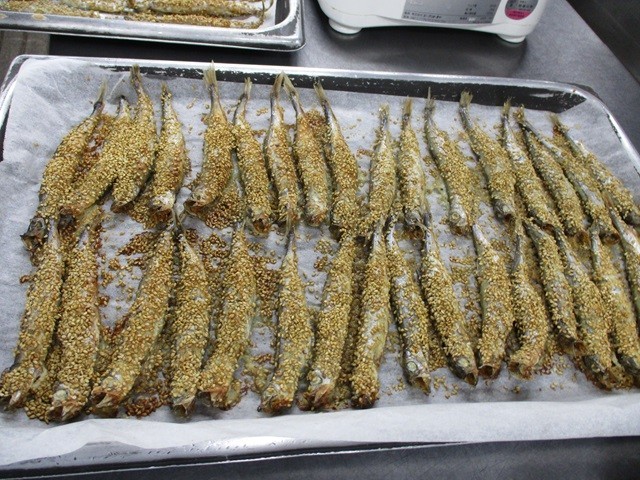 脂がのったししゃもにごまをまぶして焼き上げた一品。表面は香ばしく、ごまの風味とししゃものうま味がよく合い、頭から尾までおいしくいただけました。