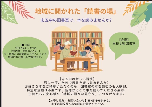 週に一度、志村五中の図書室で読書を楽しんでみませんか。