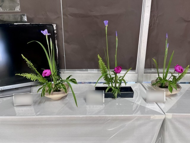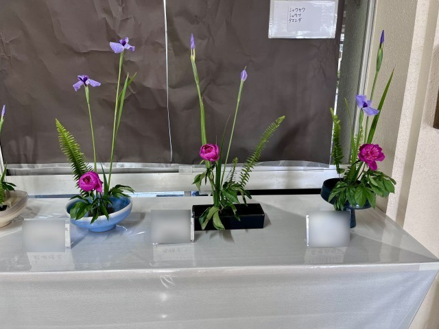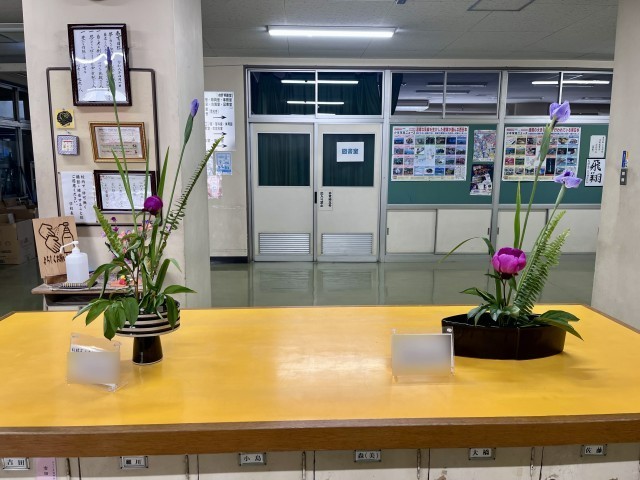 茶華道部では、4月のお花としてシャクヤク、ショウブ、タマシダを生け、生徒昇降口と職員玄関に飾りました。