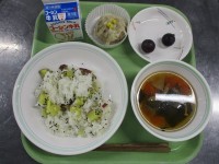 スペイン・中南米風料理です!鶏肉の旨味がたっぷり染み込んだご飯に、赤ピーマン、コーン、グリーンピースが彩りを添え、異国の香り漂う一皿でした。